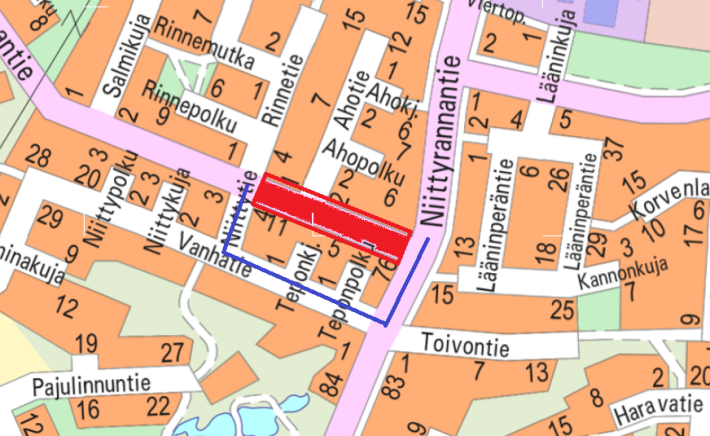 Hahtorannantien jkpp-väylän (jalankulun ja pyöräilyn väylä) rakennustyöt alkavat 16.5.2024 klo 7.00. Työt alkavat Niittyrannan puoleisesta päästä. Kuvassa punaisella merkitty alue suljetaan työmaa-alueeksi, ja sen läpiajo on kielletty. Ahotien asukkaille on järjestetty esteetön kulku. Väliaikainen kiertotie on järjestetty sinisellä merkityn reitin mukaan Vanhatien kautta. Annetaan urakoitsijalle työrauha, ja vältetään Hahtorannantien ylimääräistä läpikulkua.
