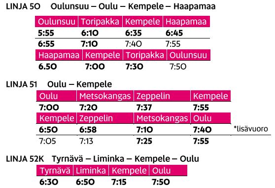 Uudet arkiaamujen aikataulut ovat voimassa 20.11.2017–3.6.2018. Linjan 51 lisäauto Kempeleestä klo 6:50 ajetaan vain koulupäivinä. Muutokset eivät vaikuta muihin linjojen 50-52 vuoroihin.