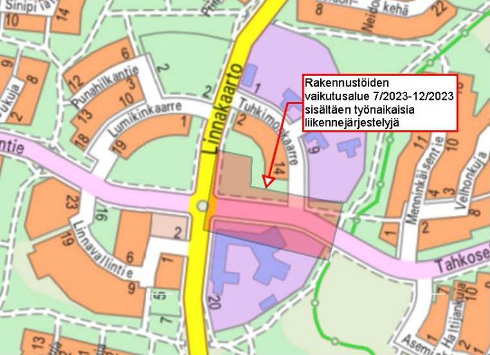 Linnakankaan koulun ympäristössä suoritetaan rakennustöitä koskien Linnakankaan moduulikoulun rakentamista, LPA-alueen (pysäköintialue) rakentamista sekä Tahkoseläntien kevyen liikenteen ylityksen rakentamista LPA-alueen läheisyydessä.