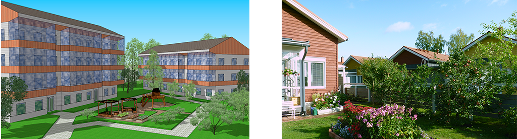Kuvat: Pirilän alueen kerrostalorakentamisen paikat valitaan huolellisesti, ja suojaiset yhteiset pihat toteutetaan puutarhakeskustan hengessä vehreinä ja viihtyisinä. Kytketyt ja erillispientalot voivat rakentua tiiviistikin. Huolellisesti rakennetut ja hoidetut puutarhat kukkapenkkeineen luovat viehättävän tunnelman.