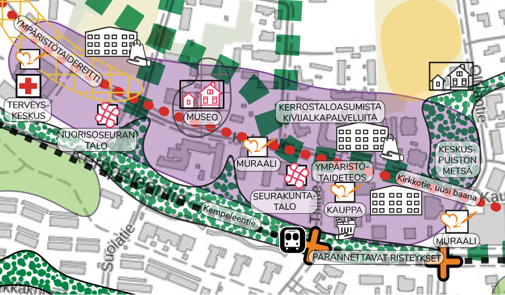 Kirkkotietä kehitetään tärkeänä keskustan halki kulkevana kävelyn ja pyöräilyn väylänä, joka kannustaa liikkumaan keskusta-alueen sisäiset matkat jalkaisin. Autoliikenne pyritään rajaamaan välttämättömään tonteille ajoon ja se sovitetaan kävelyn ja pyöräilyn rytmiin. Kirkkotien varren asuminen painottuu vastaisuudessakin tien pohjoispuolelle ja palvelut eteläpuolen kortteleihin. Kaikki Kirkkotien varren tontit ja viheralueet suunnitellaan avautumaan miellyttävästi kadun suuntaan. Kadun varrelle muodostuu vaihtelevia julkisen tilan taskuja, kuten puistot polkuineen, pienet oleskelupaikat, kotiseutumuseo ja laadukkaasti toteutetut liiketilojen pihat. Ympäristöä rikastutetaan myös taiteen keinoin, kuten tilaa rajaavin veistoksin tai mykkiä julkisivuja elävöittävin muraalein. Katutilan leveys, jäsentely ja viihtyisyys mahdollistavat jalankulkijoille suunnatut katutapahtumat.