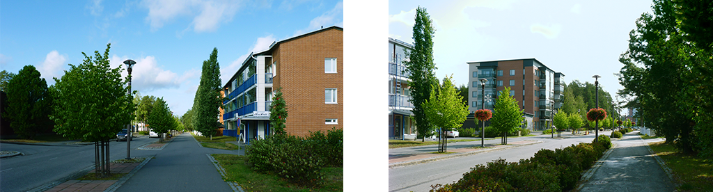 Kuvat: Kirkkotien katualue on jäsennelty istutuksin, tontit rajautuvat rakennuksin ja puurivein ja parvekkeet avautuvat viihtyisään katutilaan. Rauhallinen ja turvallinen katumiljöö houkuttelee liikkeelle kävellen ja pyörällä. Kirkkotiellä on tilaa taiteelle ja kulttuuritapahtumille.