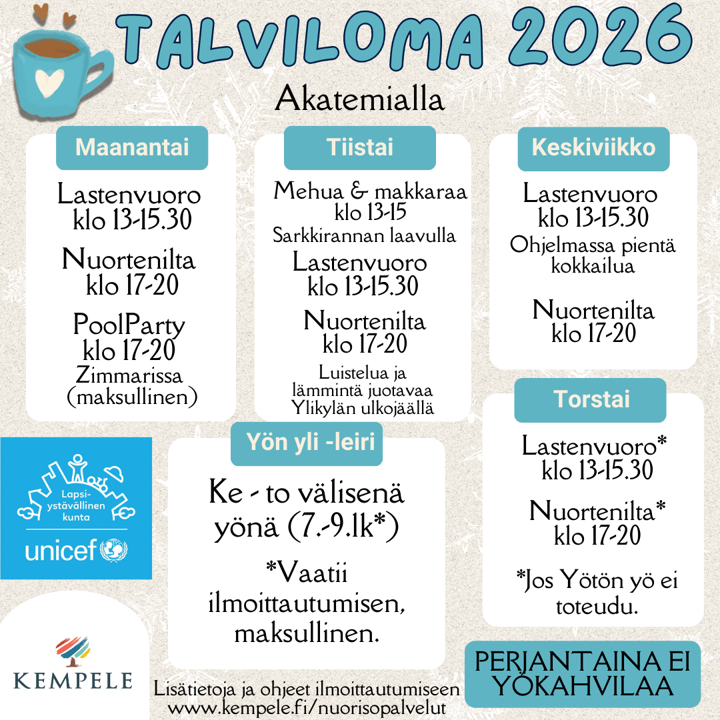 Hiihtolomalla järjetetään ilmaista toimintaa Kempele Akatemialla lasten ja nuorten vuoroilla. Osaan toiminnoista on pieni osallistumismaksu, mm.Yötönyö. Siihen on ilmoittautuminen pakollinen. Jos ilmoittautumisia on vähän, osallistujille ilmoitetaan perumisesta. Nuorisotyö on mukana Pool Partyssa