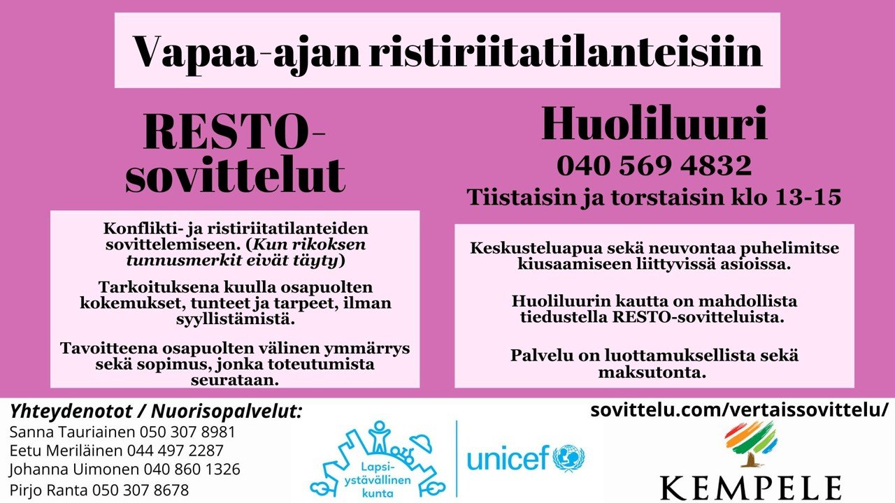 Hankkeen aikana Kempeleessä koulujen sekä nuorisopalveluiden työntekijöitä kouluttautui RESTO-sovittelijoiksi. RESTO-sovittelun tavoitteena on ristiriidassa olevien osapuolten välisen ymmärryksen lisääntyminen sekä yhteiseen sopimukseen pääseminen. Sovittelussa osapuolet tuodaan saman pöydän ääreen ja mahdollistetaan heille omien kokemusten, tunteiden ja tarpeiden sanoittaminen. RESTO-sovitteluita toteutetaan sekä koulussa että vapaa-ajalla tapahtuvissa ristiriitatilanteissa.