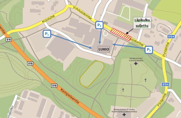 (P-paikalta lähtevä nuoli osoittaa P-paikkaa lähimmän sisäänkäynnin)